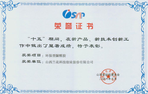 2006年10月,省經(jīng)委授予公司“十五”期間環(huán)保型脲醛膠項(xiàng)目新成品、新技術(shù)創(chuàng)新獎