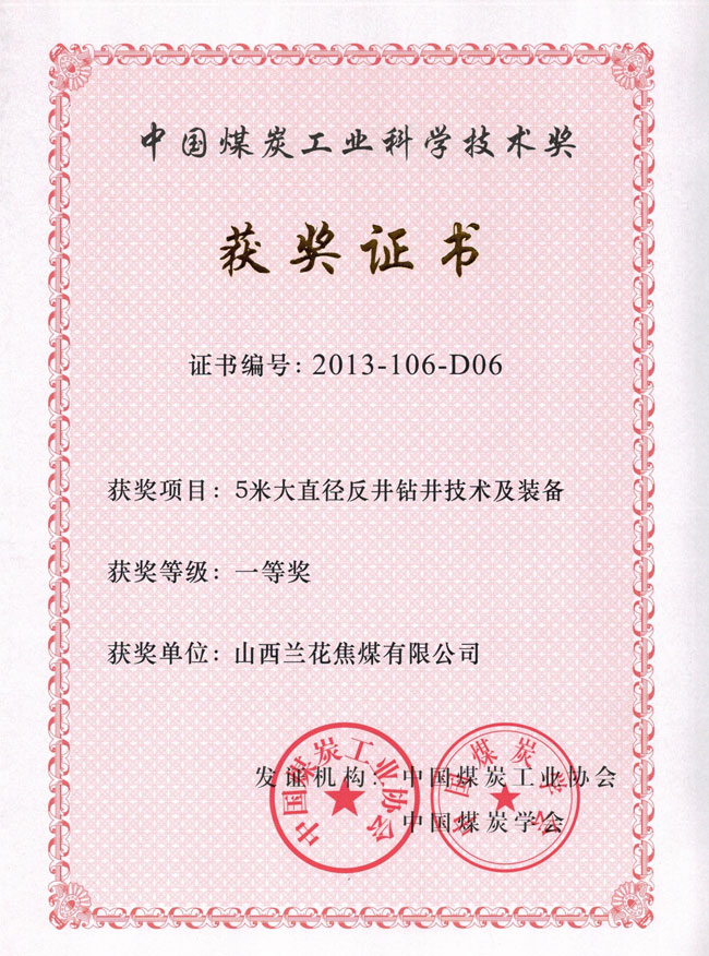 本網(wǎng)訊 日前,從中國(guó)煤炭工業(yè)協(xié)會(huì)傳來(lái)喜訊,蘭花焦煤公司應(yīng)用建井新技術(shù)5米大直徑反井鉆井技術(shù)及裝備,通過(guò)專家組評(píng)審,獲得2013年中國(guó)煤炭工業(yè)協(xié)會(huì)科學(xué)技術(shù)獎(jiǎng)一等獎(jiǎng)。