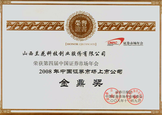 本網訊 在剛剛結束的“第四屆中國證券市場年會”上,蘭花科創以一流的經營業績、良好的社會形象和廣受贊譽的社會責任感,榮獲年會組委會授予的藍籌上市公司“金鼎獎”,成為全國獲此殊榮的十家上市公司之一,這是繼去年西山煤電之后我省第二家獲此殊榮的企業。