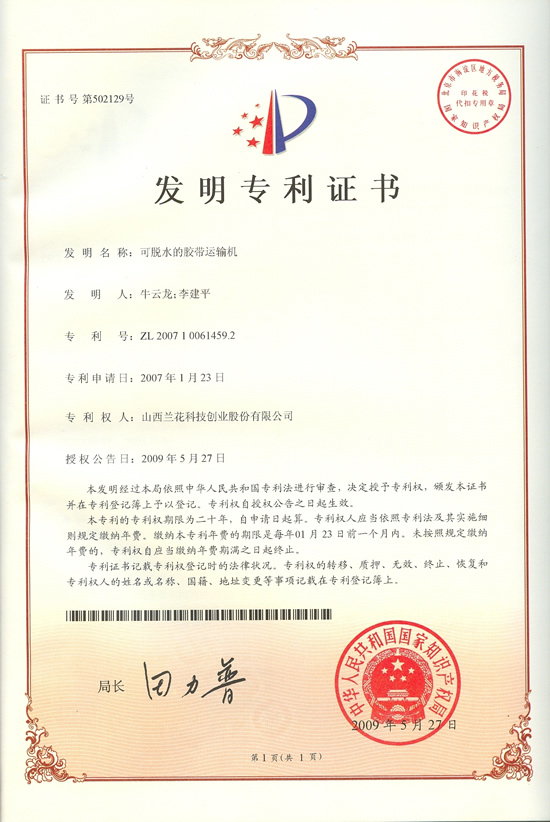 2009年,公司申請專利14項,其中發明專利3項,獲得國家知識產權局授權專利10項,其中“可脫水膠帶運輸機”獲得國家發明專利授權,實現公司發明專利零突破。
