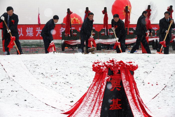 參加奠基儀式的領導共同為同寶煤業年產90萬噸礦井建設項目奠基培土。