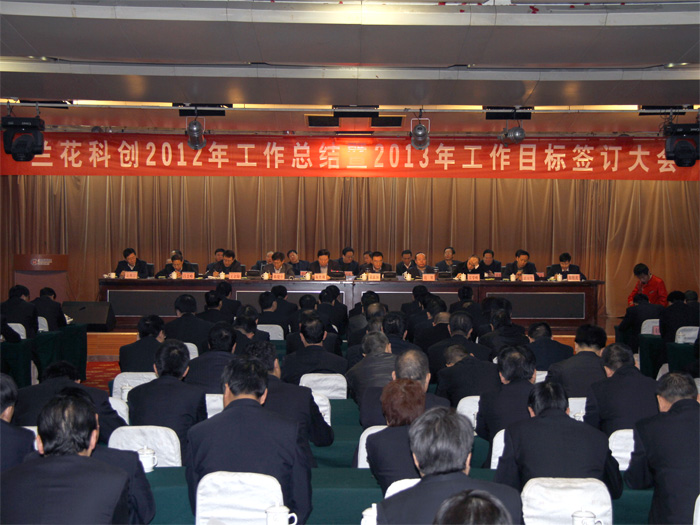 本網訊 2013年2月6日,蘭花科創召開2012年工作總結暨2013年目標簽訂大會。郝躍洲董事長出席會議并講話。陳勝利總經理總結2012年生產經營工作,安排部署2013年重點工作。韓建中副總經理主持會議。