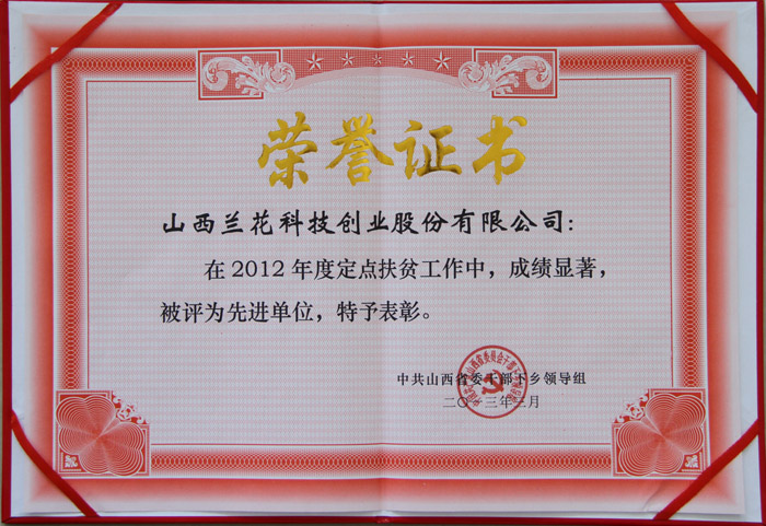 本網訊 近日,中共山西省委干部下鄉領導組對全省2012年度定點扶貧工作進行表彰,蘭花科創榮獲2012年度市縣單位定點扶貧工作先進單位。
