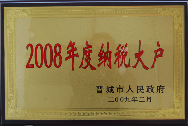 2009年2月,晉城市人民政府授予公司2008年納稅大戶