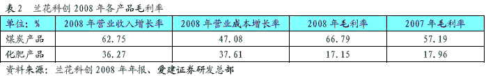 我們認(rèn)為,蘭花科創(chuàng)2008年的業(yè)績增厚主要來自于煤炭、尿素價格的超預(yù)期上漲以及營業(yè)成本的良好控制,從而使得公司毛利率得以有效提升。