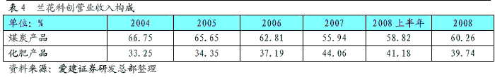 我們預(yù)計,2009年該公司營業(yè)收入構(gòu)成中煤炭產(chǎn)品的占比可能繼續(xù)上升,而化肥產(chǎn)品銷量繼續(xù)小幅下降。