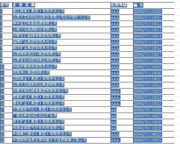 按照商務部和國資委的相關要求,在有關會員單位的大力支持下,煤炭行業信用等級評價工作經過企業申請、現場評審并向社會公示,中國煤炭工業協會最終確認,盤江煤電(集團)有限責任公司等18家企業榮獲煤炭行業AAA級信用企業稱號,太原煤炭氣化(集團)有限責任公司等4家企業榮獲煤炭行業AA級信用企業稱號。