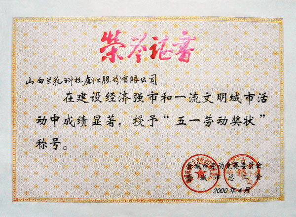 2000年4月,榮獲市總工會頒發(fā)的五一勞動獎(jiǎng)狀