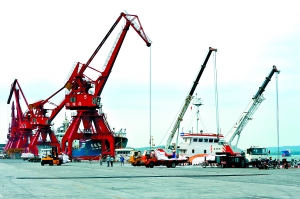 魯西化工公司的出口尿素正在青島港裝船,待發往目的地坦桑尼亞(黃繼先 攝)
