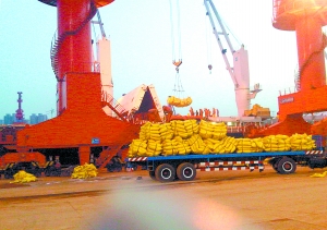 云天化集團的出口磷復肥產品正在防城港口岸裝船。 (劉碧磊 攝)