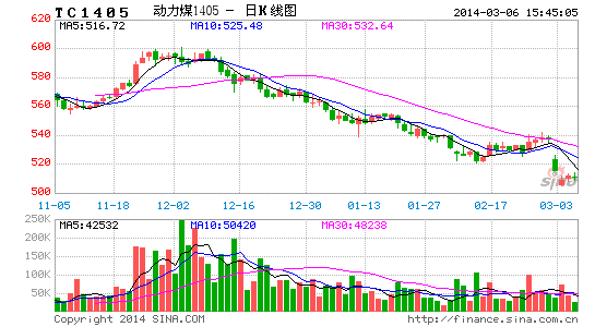 受兩大煤企降價影響,3月3日,動力煤期貨主力合約(TC05)早上開盤迅速跌停至515.6元/噸,這也是動力煤期貨自上市以來的最低價,也是首度出現跌停現象。