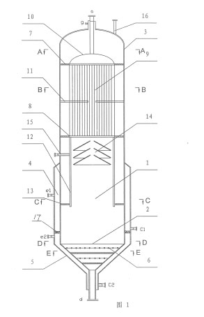 圖中:1-分離區,2-熔硫區,3-釜體,4-分離區段夾套,5-熔硫區段夾套,6-輔助加熱管,7-上花盤,8-下花盤,9-換熱管,10-罩,11-折流板,12-夾筒,13-環板,14-三層喇叭狀筒體斜管,15-測溫管,16-安全閥。