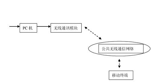 煤礦實時遠程監(jiān)控裝置,包括通過井下以太網(wǎng)與井下監(jiān)測裝置相連的進行信息采集、處理的PC機,還包括與PC機信號傳輸端口相連的無線通訊模塊,以及能與PC機無線通訊模塊進行短信交互的移動終端(如手機、掌上電腦PDA等)。其中,無線通訊模塊是現(xiàn)有產(chǎn)品,能有市面購得,例如:CDMA、GSM、EDGE、TD-SCDMA等具有無線數(shù)據(jù)傳輸功能的通訊模塊。