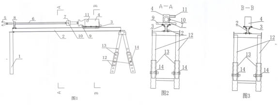 具體實施時,所述氣動回轉器4采用頂錨桿機的回轉器即可;根據導軌2結構的不同,底座3相應的移動結構亦會不同,而且底座3與導軌2之間的配合結構多樣,但對于本技術領域的技術人員來說,很容易實現;考慮到,在實現探水施工時,并不完全是水平鉆探,根據需要會調整鉆桿6的鉆探角度,因此,后支撐架12采用套管結構,內外管壁沿軸向開有若干對固位孔13,并配有用于能插入固位孔13的銷軸14,要調整鉆探角度時,取下固位孔13中的銷軸14,調整內外管的相對位置,對好內外管壁上的固位孔13,然后在固位孔13上插上銷軸14即可。