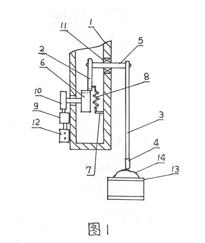 圖中:1、殼體,2、扇形齒輪,3、檢測桿,4、測料頭,5、轉動軸,6、圓形齒輪,7、固定點,8、彈簧,9、電阻變換器,10、電位器,11、軸承,12、接線端子,13、皮帶機皮帶,14、物料。