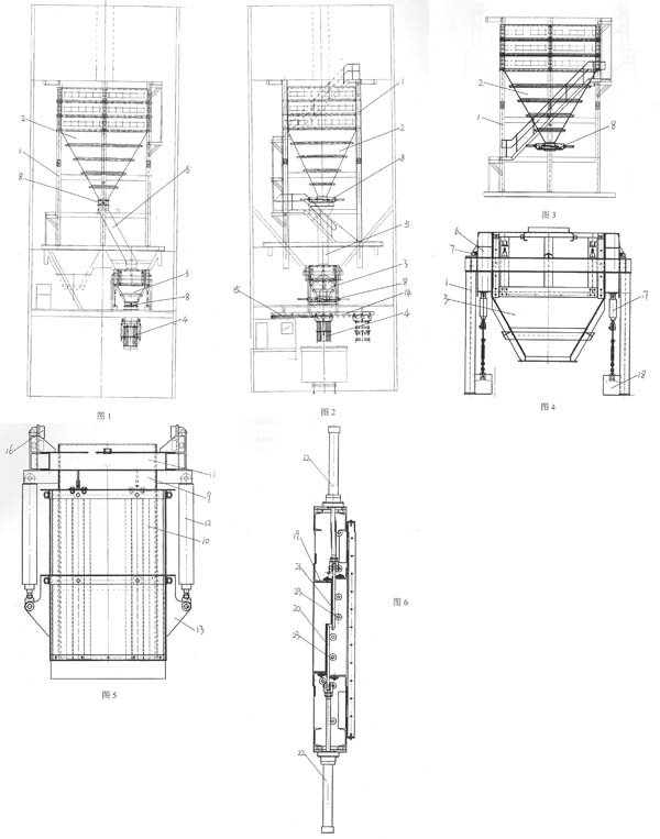 圖中:1-鋼結構框架;2-緩沖倉;3-定量倉;4-裝車溜槽;5-過渡溜槽;6-支撐架;7-稱重傳感器;8-放煤閘門;9-筒狀內溜槽;10-筒狀外溜槽;11-支撐架;12-提升油缸;13-連接件;14-滑軌;15-推移油缸;16-滑輪;17-液壓油缸;18-砝碼;19-框架;20-左閘板;21-右閘板;22-液壓油缸;23-滾輪。