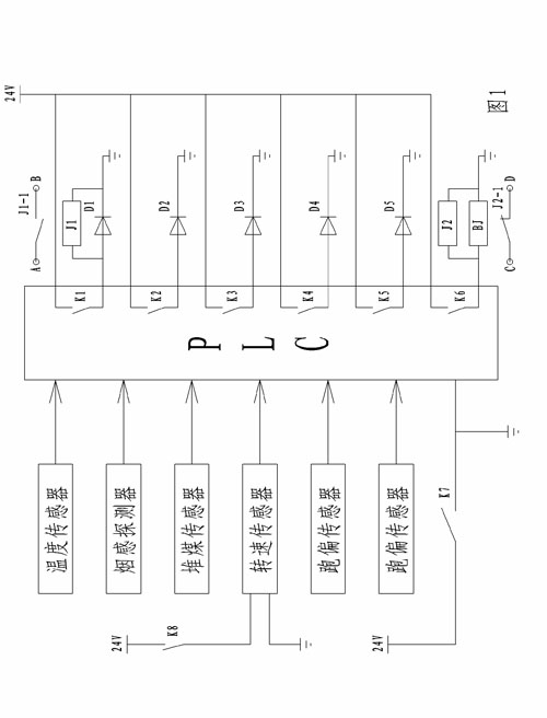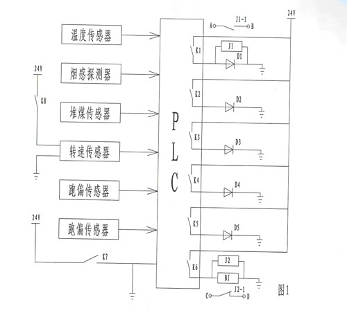 使用時(shí),狀況采樣單元中:溫度傳感器用以監(jiān)測帶式輸送機(jī)主滾筒(即主動(dòng)滾筒)軸承處的溫度;煙感探測器用以監(jiān)測帶式輸送機(jī)主滾筒上方的煙霧狀況;溫度傳感器和煙霧傳感器的設(shè)置目的是為了對(duì)帶式輸送機(jī)實(shí)現(xiàn)火災(zāi)監(jiān)測;堆煤傳感器用以監(jiān)測帶式輸送機(jī)是否發(fā)生堆煤狀況;轉(zhuǎn)速傳感器用以監(jiān)測帶式輸送機(jī)的皮帶是否發(fā)生打滑狀況;跑偏傳感器用以判斷帶式輸送機(jī)皮帶是否跑偏;當(dāng)上述傳感器監(jiān)測到狀況發(fā)生時(shí),即會(huì)向PLC控制器輸出相應(yīng)信號(hào),由PLC控制器控制相應(yīng)的常開接點(diǎn)閉合,進(jìn)而驅(qū)動(dòng)狀況顯示單元中相應(yīng)的狀況指示燈發(fā)光,用以指示出帶式輸送機(jī)發(fā)生何種故障;同時(shí),PLC控制器閉合串聯(lián)于繼電器J2的供電回路中的常開接點(diǎn),繼電器J2和聲光報(bào)警器得電,聲光報(bào)警器報(bào)警,繼電器J2的串聯(lián)于帶式輸送機(jī)開關(guān)控制回路中的常閉觸點(diǎn)J2-1斷開,帶式輸送機(jī)開關(guān)控制回路斷路,帶式輸送機(jī)停止運(yùn)行;其中,在溫度狀況指示燈D1發(fā)光的同時(shí),與溫度狀況指示燈D1并聯(lián)的繼電器J1也同時(shí)得電,其串聯(lián)于帶式輸送機(jī)自動(dòng)灑水裝置電磁閥控制回路中的常開觸點(diǎn)J1-1閉合,控制自動(dòng)灑水裝置的電磁閥動(dòng)作,由自動(dòng)灑水裝置對(duì)超溫點(diǎn)(即主滾筒)進(jìn)行降溫防止火災(zāi)發(fā)生。所述溫度傳感器、煙感探測器、堆煤傳感器、轉(zhuǎn)速傳感器、以及跑偏傳感器皆是現(xiàn)有產(chǎn)品,可由市面購得。