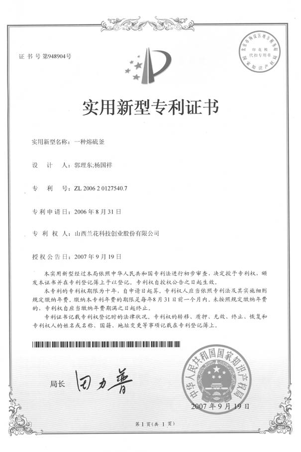 近日,公司2006年8月31日申報(bào)的實(shí)用新型專利“一種熔硫釜”經(jīng)過(guò)國(guó)家知識(shí)產(chǎn)權(quán)局初步審查,被授予專利權(quán),這是公司組建以來(lái)授權(quán)的第一個(gè)專利。