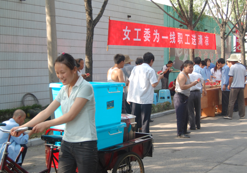 炎炎夏日,酷暑難耐,攝氏38度的高溫炙烤著大陽礦區,當人們都皺著眉頭、瞇著眼睛四處躲避陽光的時候,大陽礦生產區井口卻倩影閃爍,一派繁忙景象,幾張簡易的條桌上,西瓜、涼粉陳列有序。大陽礦女工委全體人員為一線礦工送清涼活動如火如荼,女工委主任張新花親歷親為,為廣大女工作表率,揮刀斬西瓜,微笑端涼粉,委員們忙碌左右,把切好的西瓜和調制好的涼粉親手為礦工送上,讓一線職工升井后,在太陽的烘烤下享受著女工委送清涼活動的絲絲涼爽,感激之情溢于臉上。