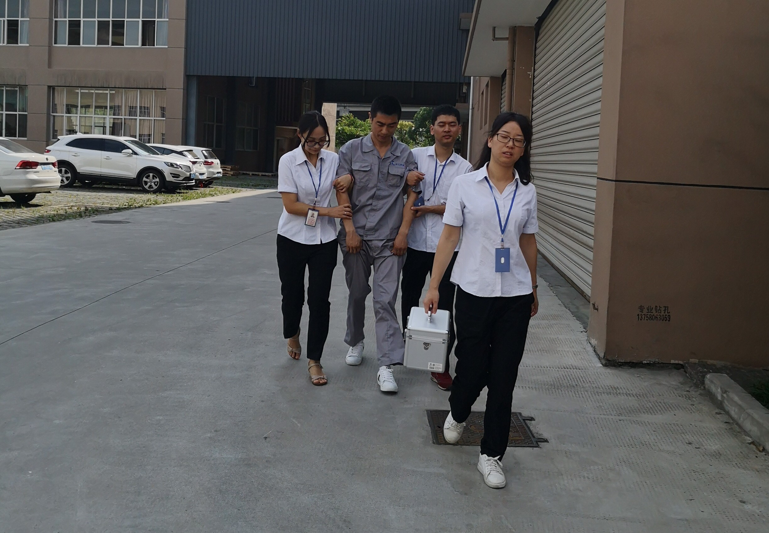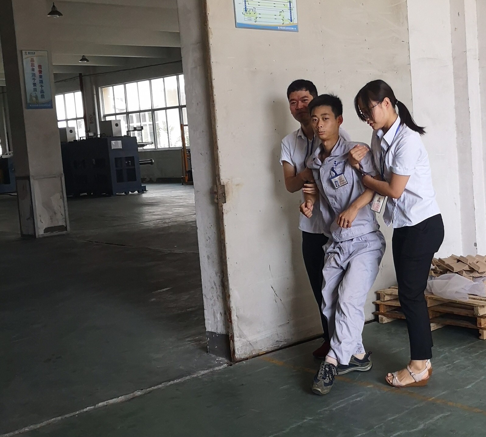 緊接著救護(hù)組、滅火組迅速來到導(dǎo)流網(wǎng)車間,展開滅火及救護(hù)工作,成功救出兩名傷者及重要物資。